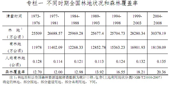 第一章 林地保護利用面臨的形勢 第一節 保護利用現狀 根據第七次全國森林資源清查(2004-2008 年)結果,全國林地總面積 30378.19萬公頃,占國土面積的 31.6%;森林覆蓋率 20.36%。林地中,有林地 18138.09萬公頃,灌木林地 5365.34萬公頃,疏林地 482.22萬公頃,未成林造林地 1132.63萬公頃,苗圃地 45.4 萬公頃,跡地(含采伐跡地和火燒跡地)709.61 萬公頃,宜林地 4403.54萬公頃,林業輔助用地 101.36萬公頃。  黨中央、國務院一直高度重視生態建設和林業發展,各級政府認真貫徹落實《中華人民共和國森林法》等有關法律法規和黨中央、國務院的林業發展方針、政策,林地保護利用取得了明顯成效。 ——促進了國土綠化和森林資源持續增長。我國森林覆蓋率已從新中國成立初期的8.6%提高到20.36%。 森林面積達到19545萬公頃,比改革開放初期增長 61%;森林蓄積量達到 137億立方米,比改革開放初期增長 34%。尤其是近 20 年來,森林面積和蓄積實現了持續增長。人工林面積達 6169 萬公頃,居世界第一位,占全球人工林面積的 38%。僅“十五”期間,全國植樹造林面積就達 3993萬公頃。 ——實現了局部生態明顯改善。改革開放以來,國家先后實施了“三北”防護林、天然林保護、退耕還林、京津風沙源治理等重點生態工程。 “三北”防護林工程造林 2400多萬公頃,工程 區森林覆蓋率提高了1倍。 天然林保護工程有效保護天然林9500多萬公頃,減少森林資源消耗 4.26 億立方米。退耕還林工程造林 2600 多萬公頃,其中退耕地造林 900 多萬公頃,工程區森林覆蓋率提高兩個多百分點。全國沙化面積由 20 世紀末的年均擴展約 3436平方公里變為目前的年均縮減約 1283平方公里, 總體上實現了從“沙逼人退”向“人逼沙退”的歷史性轉變。 ——保護了生態區位重要地區的林地資源。2001 年以來,共區劃界定國家級公益林地 10500多萬公頃, 中央財政每年支出的公益林補償費已超過 30 億元;建立了各類自然保護區總面積 達 12200多萬公頃,約占國土面積的12.7%;已建森林公園 2151處,總經營面積 1597.47萬公頃,有效保護了全國生態區位重要地區的林地及生物多樣性。新中國成立以來,國務院確定了重點國有林區,并建立了一批國有林業局;還先后建立了 4466 個國林地相關概念及劃分標準林地:根據《中華人民共和國森林法實施條例》,林地包括郁閉度 0.2以上的喬木林地以及竹林地、灌木林地、疏林地、采伐跡地、火燒跡地、未成林造林地、苗圃地和縣級以上人民政府規劃的宜林地。 有林地:連續面積大于 0.067hm2、郁閉度 0.2 以上、附著有森林植被的林地,包括喬木林地和竹林地。 灌木林地:由灌木樹種或因生境惡劣矮化成灌木型的喬木樹種以及胸徑小于 2cm 的小雜竹叢組成,以經營灌木林為目的或起防護作用,連續面積大于0.067hm2、覆蓋度在30%以上的林地。其中:國家特別規定灌木林地(特灌林地):具有一定經濟價值,以取得經濟效益為目的進行經營的灌木林,或者分布在干旱、半干旱地區和喬木生長界限以上專為防護用途,且覆蓋度大于30%的灌木林地。 疏林地: 由喬木樹種組成, 連續面積大于0.067hm2、 郁閉度在0.10-0.19之間的林地。 采伐跡地:采伐后保留木達不到疏林地標準、且尚未人工更新或天然更新達不到中等更新等級的林地。 火燒跡地:火災后活立木達不到疏林地標準、且尚未人工更新或天然更新達不到天然幼苗3000株/hm2以上或幼樹500株/hm2以上的林地。 未成林造林地:造林或封育后不到成林年限,當年造林成活率85%以上或保存率 80%(年均等降水量線 400mm 以下地區當年造林成活率為 70%或保存率為 65%)以上,飛播造林后保留苗木 3000 株/hm2以上或沙區成苗 2500株/hm2以上,封育地天然幼苗 3000 株/hm2以上或幼樹 500 株/hm2以上,分布均勻,尚未郁閉但有成林希望的林地。 苗圃地:固定的林木、花卉育苗用地。 宜林地:經縣級以上人民政府規劃為林地的土地。包括宜林荒山荒地、 宜林沙荒地和其他宜林地。 郁閉度:單位面積喬木樹冠垂直投影面積之和,用十分數表示。 森林覆蓋率:一定行政區域范圍內有林地與特別規定灌木林地面積占土地總面積的百分率。 有林場,重點林區的森林資源得到了有效的保護利用。 ——提高了木材及林產品供給能力。新中國成立 60 年來,累計為社會提供木材 60 多億立方米,人造板、地板、家具、松香等林工產品產量居世界首位,經濟林、花卉、紫膠、活性炭等林副林特產品產量居世界前列。2008 年,我國林業產業產值達到 1.44 萬億元,林產品進出口貿易額突破 700 億美元,已躍升為世界林產品生產和貿易大國。 但必須清醒地看到,我國目前仍然存在人多林少、人與林地關系緊張的矛盾,林地保護利用依然面臨著一些突出問題。 ——林地總量不足,逆轉日趨嚴重。我國森林覆蓋率僅為世界平均水平的 2/3,居世界第 139位,用占全球 4.7%的森林支撐占全球 23%的人口對生態和林產品的基本需求。 我國人均有林地 面積 0.13公頃,僅為世界人均水平(0.6公頃)的 22%;林地逆轉日趨嚴重,第七次全國森林資源清查數據表明,清查 5年間隔期內因毀林開墾、自然災害、工程建設等導致林地轉為非林地面積達 832萬公頃,其中近 85%逆轉為其他農用地。有林地逆轉為非林地的面積為 377萬公頃, 相當于同期全國造林面積的十分之一。 ——林地質量不高,生產力低下。我國大部分林地分布在干旱半干旱地區,土層瘠薄