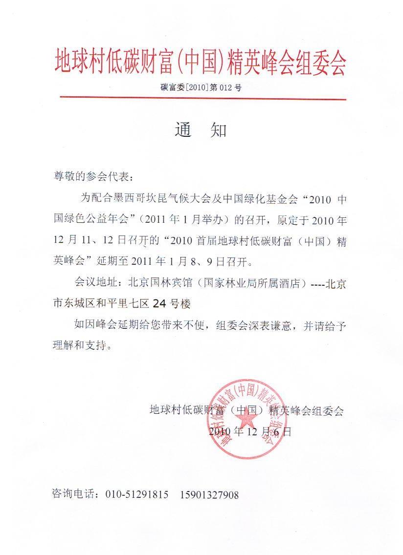 關于地球村低碳財富峰會延期舉辦通知